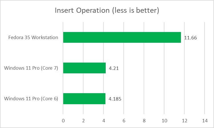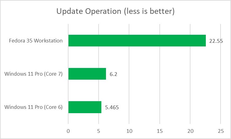 As you can see in the charts, Windows took 4.21 hours to insert the 41M rows, while Fedora took 11.66 hours. In the update operation, the difference in performance is even larger: Windows took 6.2 hours to load and update all 41M rows, while Fedora took an astounding 22.55 hours. I'd like to say I am very disappointed with the Linux performance, I thought it would be at least comparable with the windows environment.