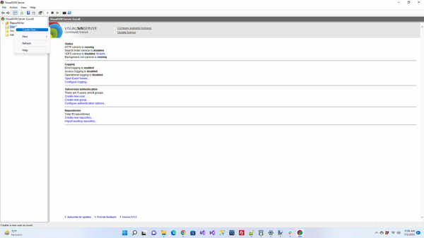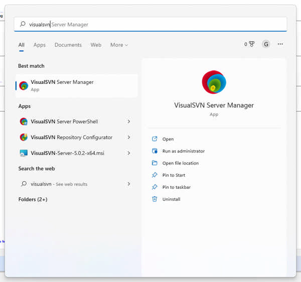 Open the VisualSVN Server application by clicking on the Start menu, then typing in "Visual SVN". The application should be listed.