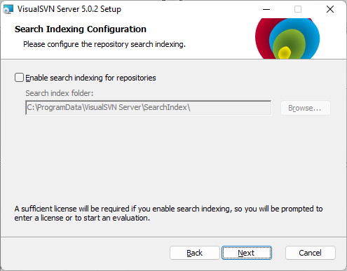 I usually leave the search indexing disabled for the repositories. Click on "Next".