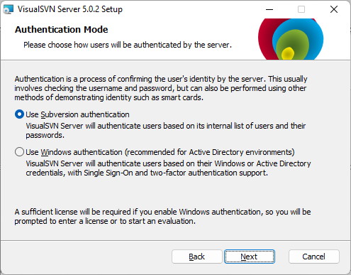 In this step, I prefer selecting the "User Subversion authentication" option (we will create a user in a later section of this post before creating a new repository). Click on "Next".